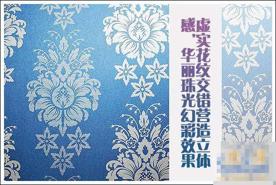 采用銀色歐式花朵圖案,實花紋與虛花紋交錯,產生了實紋浮起、虛紋深入的獨特立體感。色彩具有幻彩效果,能依角度光線不同而變化。寶石藍底色使視覺效果更加典雅、神秘。