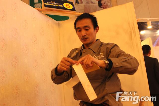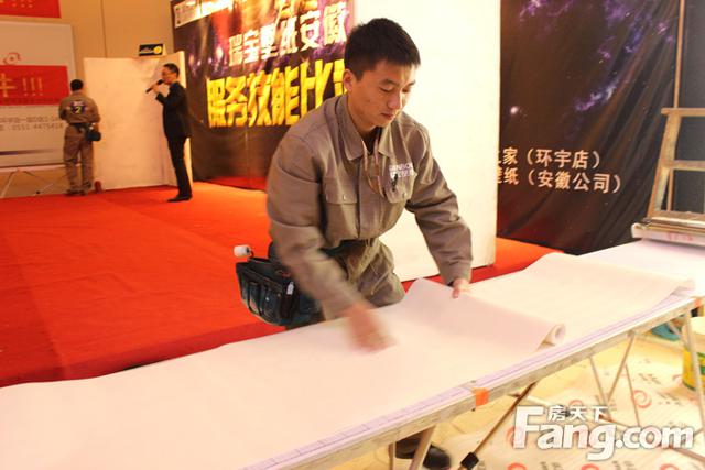 14點(diǎn)整,來(lái)自安徽省22位瑞寶參賽選手,兩人一組,先后登臺(tái),現(xiàn)場(chǎng)在木板墻上展示瑞寶壁紙張貼。參賽的選手均為每個(gè)城市的一流技師,擁有精湛的技術(shù),過(guò)人的感知。原本“墻”和“壁紙”是兩個(gè)不同的個(gè)體,但在他們的把玩下兩者融為一體,完美無(wú)瑕,令人拍案叫絕。