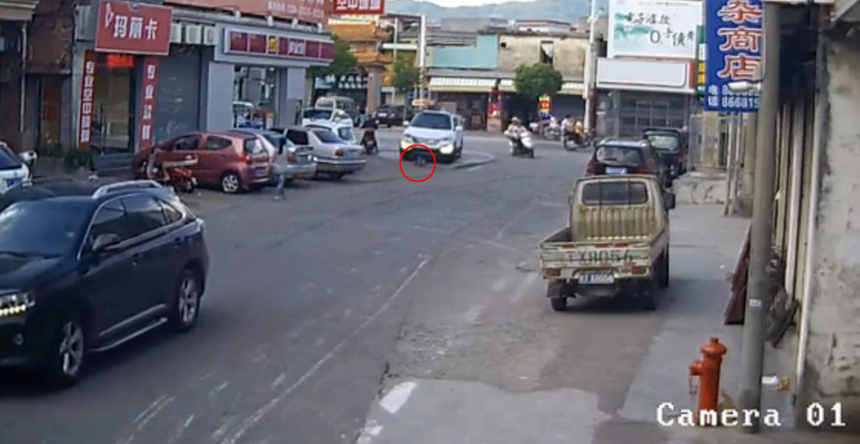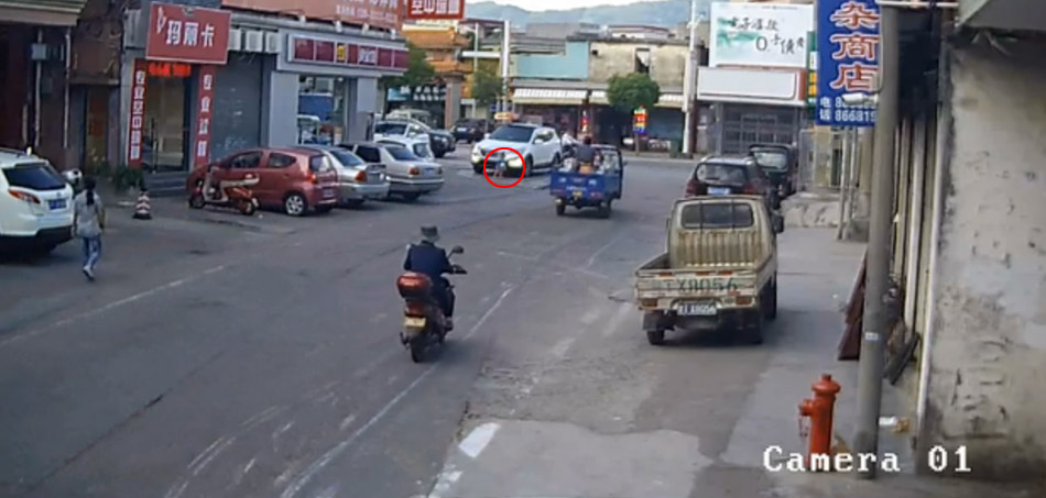 監(jiān)控顯示,文文跑過士多店門口后,就站在一輛原本停放著的SUV車前,不停張望著。沒過多久,SUV啟動向前徑直將文文撞倒后,右前輪碾壓了上去。事發(fā)后,SUV沒有停下繼續(xù)往前開。