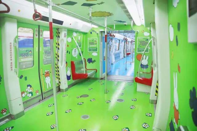 “我是半個(gè)世紀(jì)來,最受世界喜歡的小兔兔。”專列上,長耳朵的Miffy向大家做自我介紹。根據(jù)Miffy不同的衣服顏色,專列車廂分別布置成藍(lán)綠橙黃四種顏色,地板上“生長著”花花草草,讓乘客儼然置身童話之中。