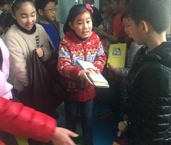 本次活動在“互動游戲”、“贈送書本”、“才藝展示”、“感恩寄語”四個環(huán)節(jié)中愉快的展開。“瞧,四七中隊的王新月親手把自己的文具盒羊絨玩具贈給了三十崗村的留守兒童董思晨”,在活動中讓孩子們說出了自己對感恩的理解,架起了孩子和孩子之間溝通的橋梁和友誼。為了表達對六安路小朋友們圖書和學習用品捐贈的感恩,在最后的“感恩寄語”環(huán)節(jié),我村的留守兒童侯競軒唱了一首《感恩的心》表達對她們的感謝和祝福。