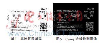 本系統(tǒng)采用了形態(tài)學(xué)運算中開運算和閉運算方法過濾,得到可能為二維碼的區(qū)域,在系統(tǒng)進行開運算和閉運算之前,濾除火車票背景的干擾圖像并用Canny算子識別強度圖像中的邊界。Canny算子是比較經(jīng)典的且應(yīng)用廣泛的邊緣檢測算法。濾除火車票外部背景且將感興趣的二維碼區(qū)域圖像增強了,但是火車票上面的干擾字也會隨著增強。濾除背景圖像效果如圖4所示,Canny邊緣檢測效果如圖5所示。