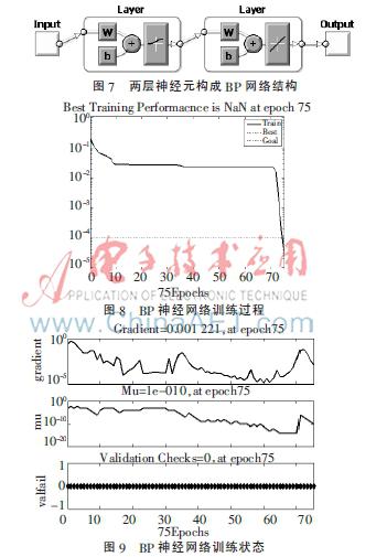 BP神經(jīng)網(wǎng)絡(luò)采用兩層神經(jīng)元構(gòu)成,其模型如圖7所示,BP神經(jīng)網(wǎng)絡(luò)訓(xùn)練過程及訓(xùn)練狀態(tài)分別如圖8、圖9所示。