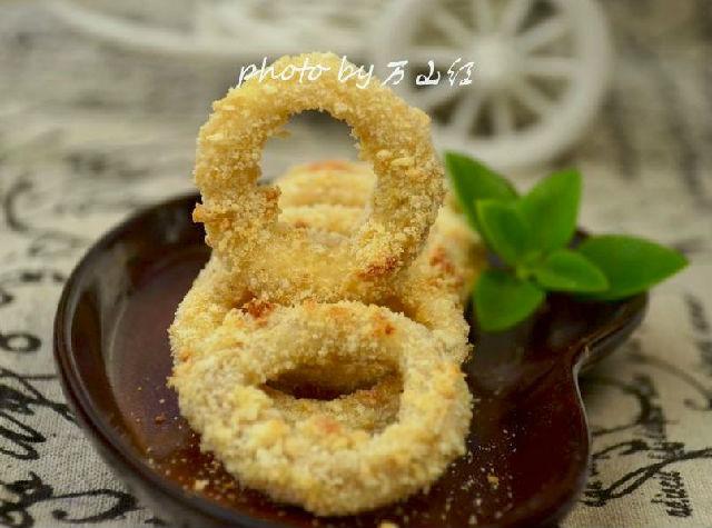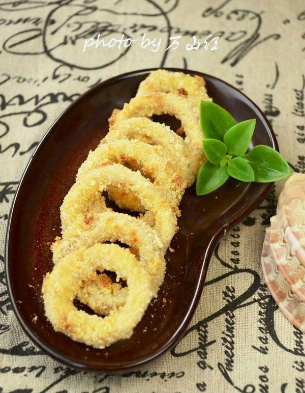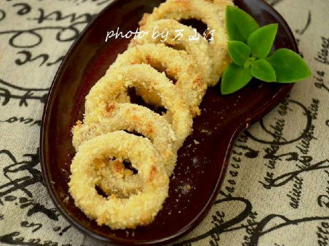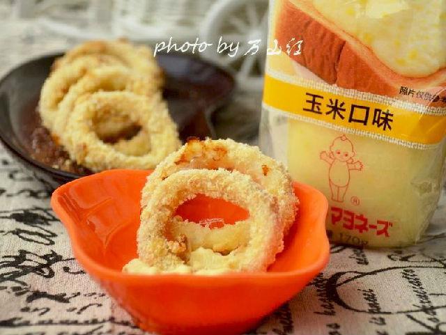 原料:魷魚(yú)圈400g 雞蛋1個(gè) 面包糠適量 胡椒粉2g 鹽2g 沙拉醬適量 黃酒5g 玉米淀粉適量 做法