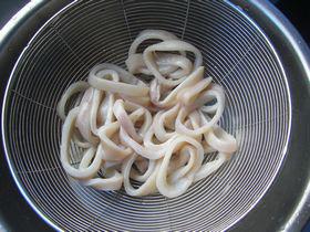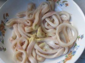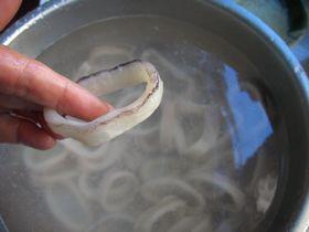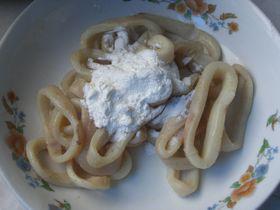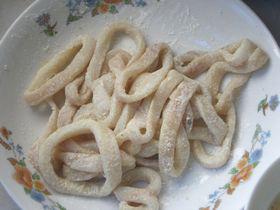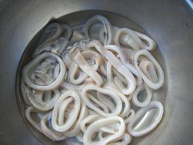 1、直接買(mǎi)了魷魚(yú)圈,去掉表面的黑皮,清水洗凈,撈出濾水,放胡椒粉、鹽和少許黃酒,抓拌均勻,腌制10分鐘,最后放一點(diǎn)干淀粉,拌均勻。