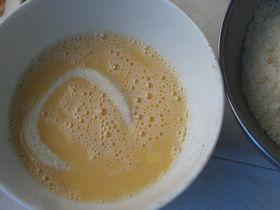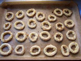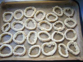 2、粘了淀粉的魷魚(yú)圈在蛋液中沾一下,在面包糠中沾滿(mǎn)一層面包糠,擺放到鋪了油紙的烤盤(pán)中。