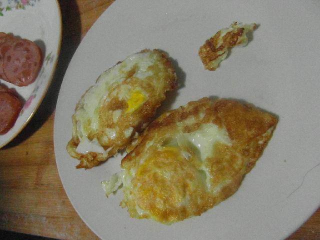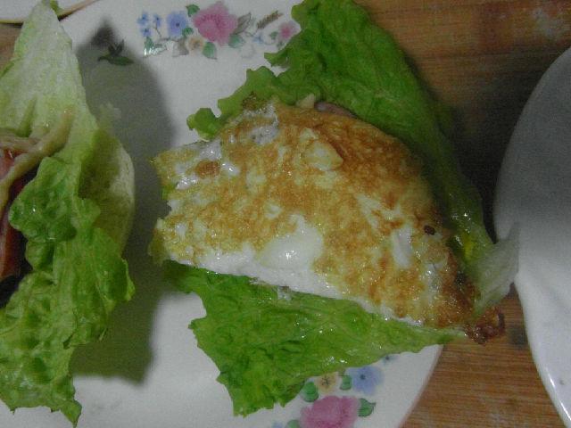 9,夾上一個雞蛋,雞蛋攤的大了只好從中間切開來用。