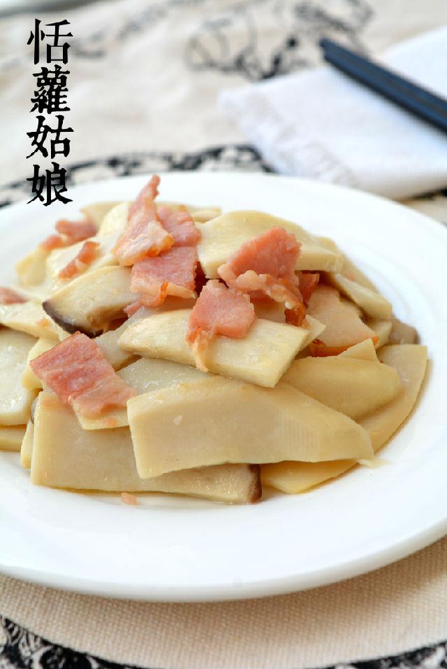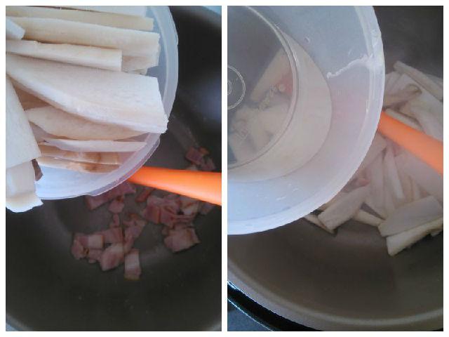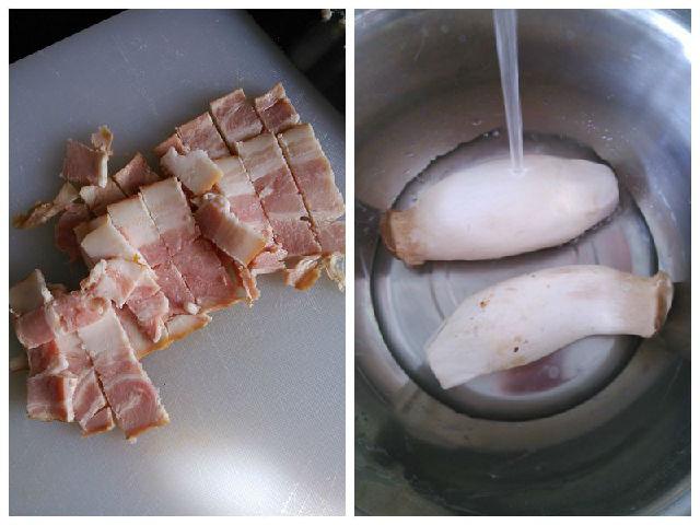 7、培根稍微變色之后放進(jìn)去杏鮑菇;