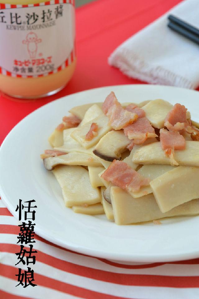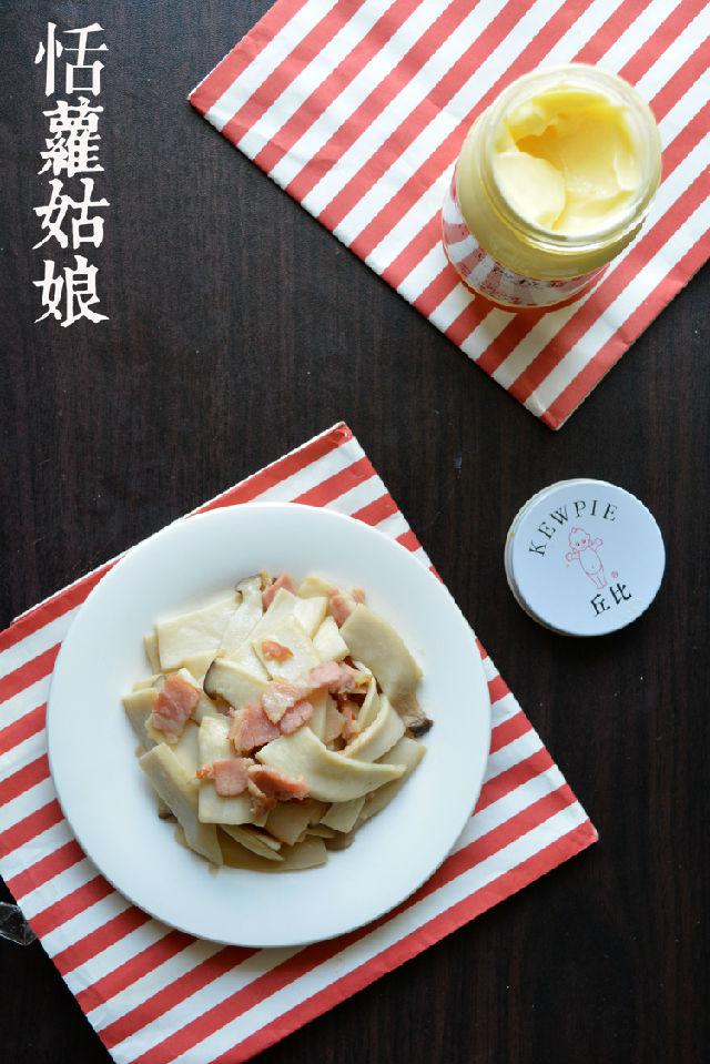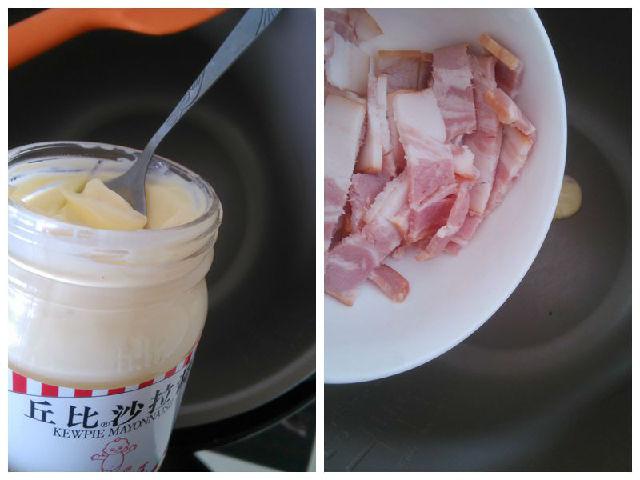 培根兩大片,杏鮑菇兩個(gè),丘比沙拉醬,食鹽;