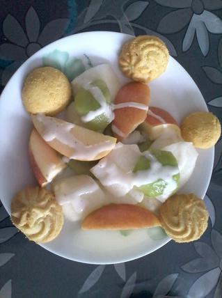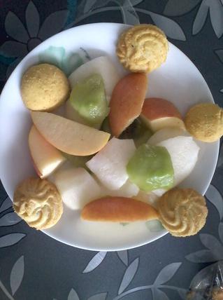 3. 獼猴桃,梨子,蘋果切塊,曲奇點綴。