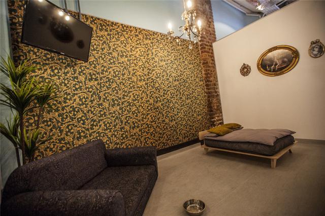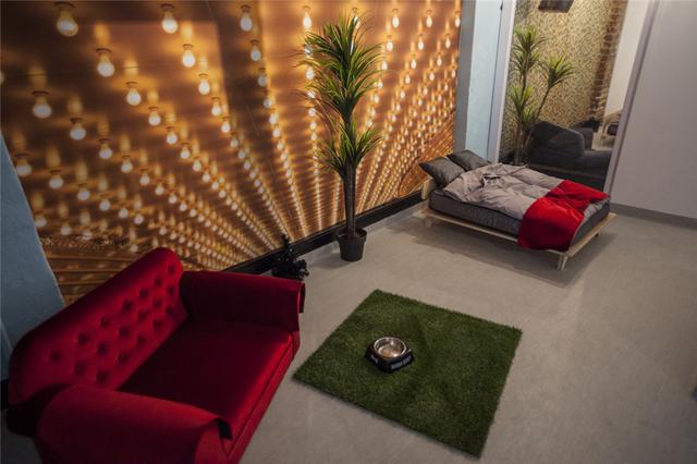 這樣的套房是為了呼應(yīng)狗旅館的幽默基調(diào)。從簇絨的狗沙發(fā)到放著羽絨被的床,處處都能讓狗狗感到舒適。(網(wǎng)站截圖)