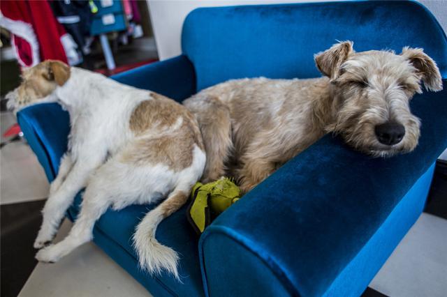 在一把天鵝絨椅子上,兩條小狗在它們的狗嚼棒旁邊自在地打盹。(網(wǎng)站截圖)