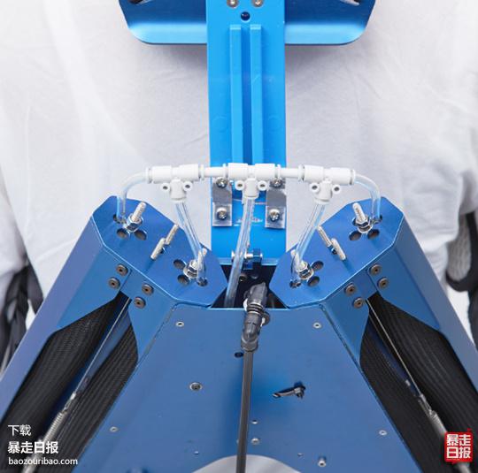 這件衣服的動(dòng)力主要來(lái)自背后的液壓閥,衣服分為“標(biāo)準(zhǔn)版”和“輕便版”,標(biāo)準(zhǔn)版本身重5.5KG,可以增加承重30KG,而輕便版本身4.2KG,可以增加承重22KG,還是很不錯(cuò)噠~