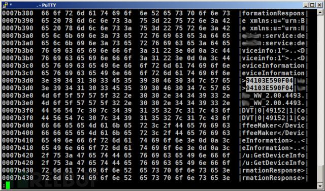 當聯(lián)網(wǎng)咖啡機打開時,它就自動打開了一個未加密的熱點,可竊聽UPNP流量。在客戶端,智能手機上安裝的app是由咖啡機廠商提供的,它會連接到一個熱點并發(fā)送UDP請求廣播,以搜索UPNP設(shè)備?Х葯C會與app建立一個通信,以交換諸如SSID、無線密碼等數(shù)據(jù),然而不幸的是,這些交換的數(shù)據(jù)全是明文的。