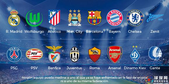 小組第一:皇馬、沃爾夫斯堡、馬競、曼城、巴塞羅那、拜仁、切爾西、澤尼特
