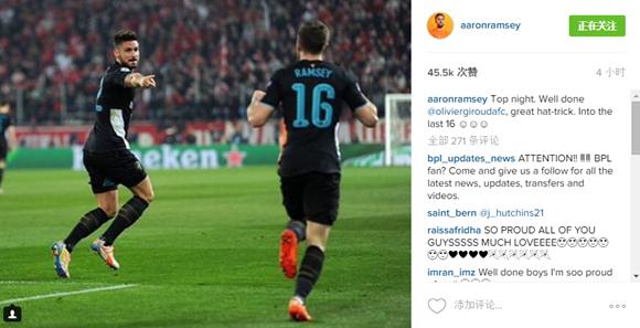拉姆塞:吉魯干得好!槍手進入16強了。