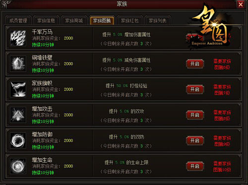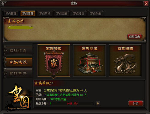 9377《皇圖》 家族等級至高為十級,使用家族資金可升級家族等級與其他功能,等級越高可享受的福利就越好。家族資金通過行會成員捐獻非綁定銅錢獲得,而家族貢獻可使用來領兌換家族商城物品。家族紅包可領取其他家族成員發(fā)放的紅包,自己也可以發(fā)放紅包哦。說時遲那時快,小編已經(jīng)加入了家族了,妹紙妹紙,你在哪兒~!