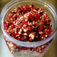6. 裝入后,要用自制的山茶油封存!這樣做出來的剁辣椒特別香![如果沒有茶油,其它油也可以],接著用保鮮膜密封住,擺放在陰涼處,讓剁辣椒充分自然發(fā)醇,三天后放置冰箱內(nèi)!一個月后開蓋品嘗!