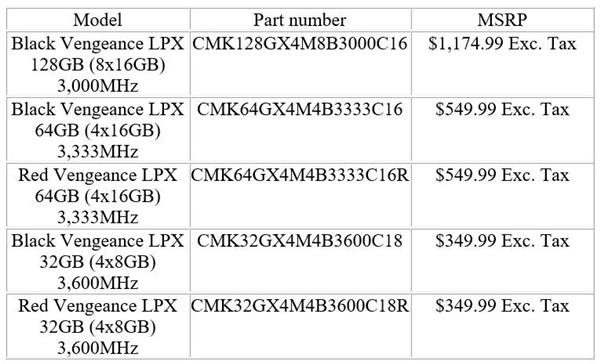 海盜船的Vengeance LPX系列這次增加了8×16GB、4×16GB、4×8GB三種套裝,額定頻率依次為3000MHz、3333MHz、3600MHz。