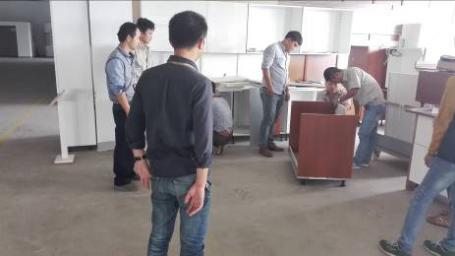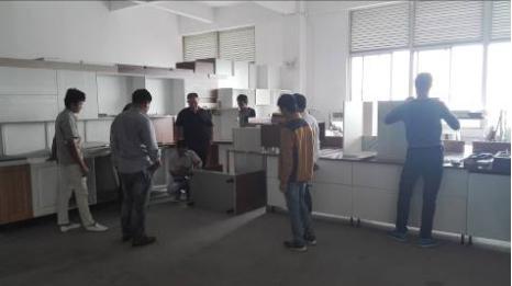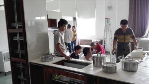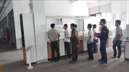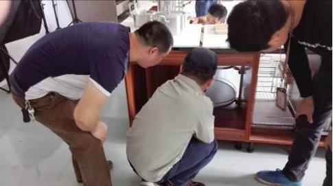 (圖:工廠技術工程師劉清貴在給師傅做工藝升級水槽柜、灶臺柜安裝指導)