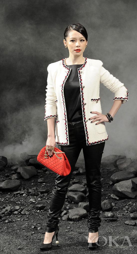 徐若瑄這件白色的香奈兒粗呢外套竟來自于CHANEL 2011春夏發(fā)布的男裝 ,真是讓人眼前一亮!粗獷的線條加之成熟性感的紅唇,將徐若瑄永遠(yuǎn)20歲的輕熟形象來了個(gè)180度大轉(zhuǎn)型。不得不感嘆徐妹妹的用心良苦。
