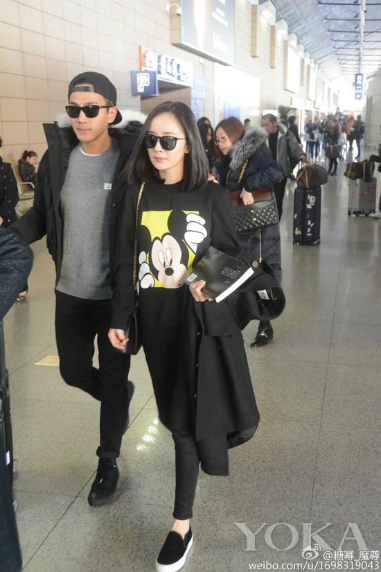 楊冪穿著太平鳥風(fēng)尚男裝米奇衛(wèi)衣站在劉愷威身旁俏皮可愛更透著濃濃的幸福感。
