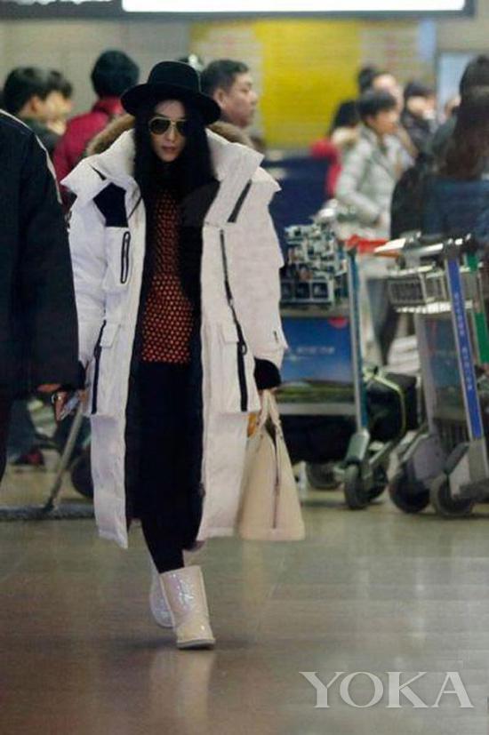 范冰冰身著Paul Smith 2012秋冬男士系列的蜂窩印花橙色上衣,搭配白色羽絨風(fēng)衣、黑色長(zhǎng)褲、黑色寬檐帽、LV Almabag以及一雙熒光色的ugg。