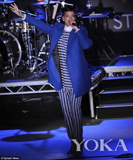 蕾哈娜身穿Raf Simons 2012秋冬男裝系列寶藍(lán)色Oversized西裝外套,搭配Acne 2013春夏男裝系列條紋背心+款式長(zhǎng)褲,加上一雙女人味的高跟鞋,酷帥吊炸天。