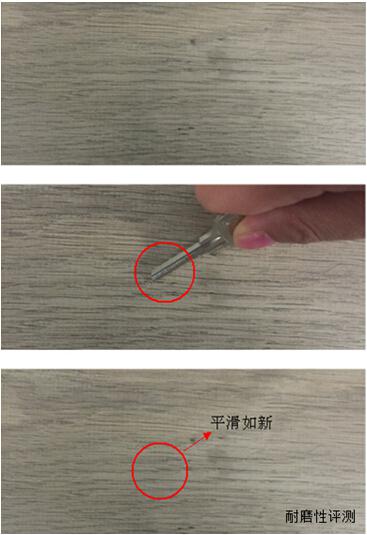 小編用鑰匙尖銳部分用力在地板上來回劃過,地板表面沒有出現(xiàn)起皮、劃痕等現(xiàn)象,可見該款地板耐磨性能十分優(yōu)越,經(jīng)得起考驗(yàn),相信在日常生活中我們便不用擔(dān)心鞋子或其他摩擦性的東西對(duì)地板造成損傷了。
