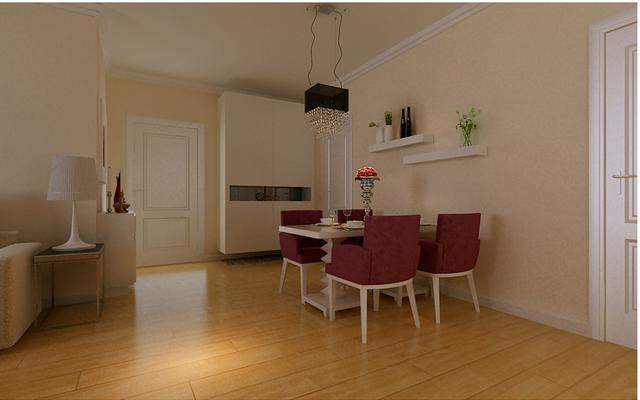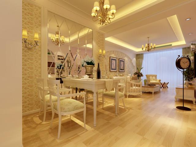 【餐廳】由于客廳和餐廳區(qū)跨距不同,配以藝術(shù)鏡面,增加了空間縱深感。客餐廳壁紙的整體搭配配以壁燈的輕微輔助光點(diǎn)綴,畫龍點(diǎn)睛。