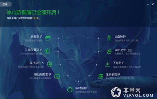 提倡“三不“原則的百度殺毒,因一貫采用輕巧簡潔的設計而備受用戶酷愛。繼去年的”onebutton“理念之后,今年上線的5.0版本,更加凸顯了”冰山“防御理念,整體產(chǎn)品界面看似一處干凈無疑的冰山一角,沒有任何多余的大小功能導航欄。在冰山界面的下方,百度殺毒用白色凸顯了其最為優(yōu)勢的三個場景化功能:彈窗攔截、網(wǎng)購保鏢及瀏覽器保護,點擊更多則進入更多防護場景。對于慣常喜愛將功能累加在首頁的國內(nèi)安全產(chǎn)品而言,百度殺毒的體驗再次凸顯了簡潔、輕巧。