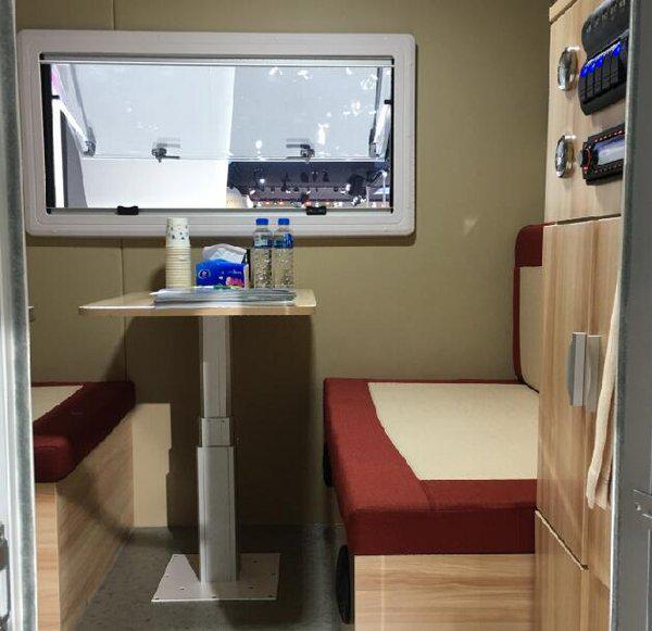 整體車廂采用現(xiàn)代化家居設(shè)計(jì)理念,并配以木紋家具,給人以成熟穩(wěn)重的感覺。車內(nèi)“小客廳”,不僅能看超清電視,搭配一對(duì)組合沙發(fā)和升降桌,一家四口吃飯絕對(duì)沒問題。長沙發(fā)還能立馬變身單人床,解決睡覺問題。客廳上方有專門的臥室,雙人床給你更好的私密空間,舒舒服服睡大覺。