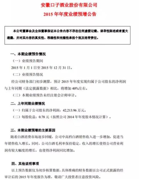該公告還表示,隨著白酒消費(fèi)市場(chǎng)逐步回暖,口子窖中高檔白酒銷售收入進(jìn)一步增加,促進(jìn)了公司2015年銷售收入增長(zhǎng)。同時(shí),公司白酒毛利率保持穩(wěn)定,收入的增長(zhǎng)使得公司營(yíng)業(yè)利潤(rùn)有較大幅度的增長(zhǎng),也使得凈利潤(rùn)同比增加。