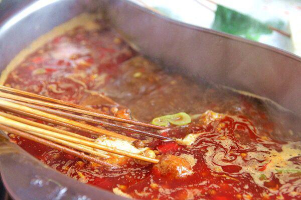 點的鴛鴦鍋底,秘制紅湯鍋底是牛油的,用幾十種的調(diào)料制成,據(jù)說是加了中草藥的,看起來就食欲巨增。三鮮鍋底的湯頭是用大骨熬制而成,里面有紅棗、枸杞、西紅柿、黃瓜、金針菇、蘑菇和大蔥等提味的食材,很鮮美。紅湯鍋底涮出來的串串,不蘸底料味道也不錯,要是能吃辣,一定嘗嘗他家出了名的特色干碟,秘制的辣椒料相當特別。