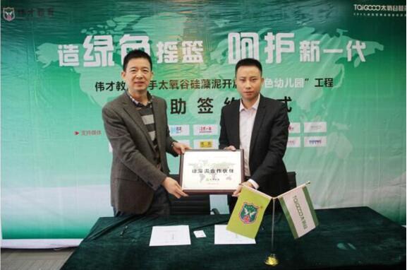 2015年12月4日,在偉才教育總部基地,太氧谷硅藻泥攜手著名教育機(jī)構(gòu)香港偉才國際教育集團(tuán),舉行了以“造綠色搖籃、呵護(hù)新一代”為主題的盛大贊助簽約儀式暨工程啟動儀式,簽定贊助幼兒音體室硅藻免費(fèi)裝修的公益協(xié)議并成功授牌,標(biāo)志著太氧谷為偉才旗下30余所幼兒園音體室全新升級、環(huán)保改造正式拉開帷幕!偉才集團(tuán)常務(wù)副總經(jīng)理計濤先生、太氧谷品牌總監(jiān)詹耀東先生共同出席了本次簽約儀式。