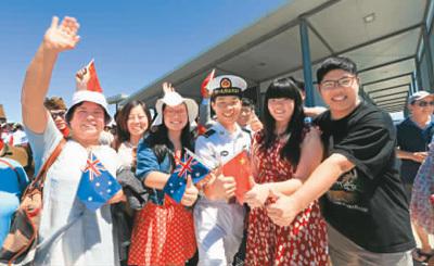 到碼頭為編隊送行的華僑華人爭相與水兵合影。