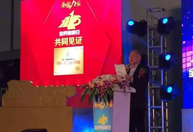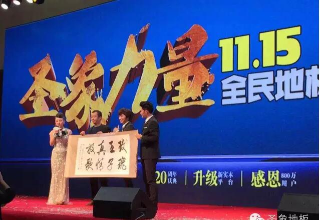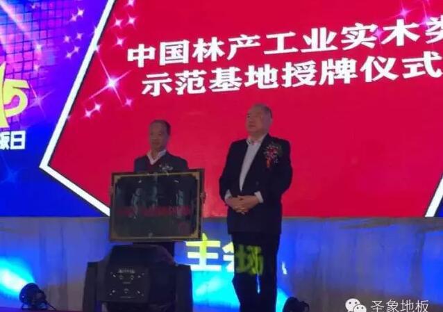 在2015年圣象力量1115全民地板日活動現(xiàn)場,中國林產(chǎn)工業(yè)協(xié)會副會長兼秘書長石峰向圣象集團(tuán)授予“中國林產(chǎn)工業(yè)示范基地(實木地板類)”的決定并向圣象集團(tuán)董事長翁少斌頒發(fā)獎牌。