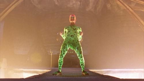金凱瑞作為一名優(yōu)秀的喜劇演員,在飾演謎語(yǔ)人這個(gè)角色時(shí)幾乎是沿用了他在《變相怪杰》中的表演風(fēng)格,都是一個(gè)小人物在一種強(qiáng)大力量的掩護(hù)下進(jìn)行著瘋狂的舉動(dòng),只不過(guò)作為變相怪杰里他是混亂正義,而作為謎語(yǔ)人他是混亂邪惡。謎語(yǔ)人這個(gè)沒什么戰(zhàn)斗力只靠頭腦解決問(wèn)題的角色在金凱瑞的扮演下非常出彩,他那夸張的表情和形體動(dòng)作讓人過(guò)目不忘,成為了經(jīng)典的反派形象。