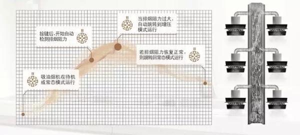 自動(dòng)巡航增壓功能主要是針對(duì)公共煙道設(shè)計(jì),解決傳統(tǒng)煙機(jī)在爆炒時(shí),油煙激增,吸排不干凈的問題。當(dāng)公用煙道外排阻力增大時(shí),自動(dòng)巡航增壓系統(tǒng)可幫助油煙順利排出。