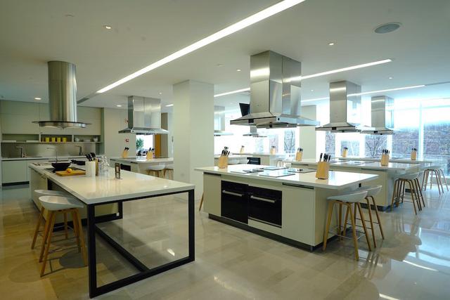 走進(jìn)體驗(yàn)館內(nèi)部,整個(gè)場(chǎng)館依功能分成三層。第一層主要是方太企業(yè)文化和產(chǎn)品展示區(qū)域,這里會(huì)展出方太最新款產(chǎn)品,而在展示區(qū)的盡頭是一方帶花園的角落咖啡吧。沿樓梯上第二層是美食學(xué)校、未來(lái)廚房及 O2O 體驗(yàn)區(qū),用戶(hù)的美食社交互動(dòng)將主要在這個(gè)區(qū)域進(jìn)行。