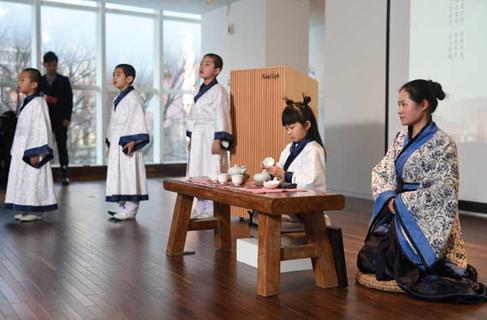 婉轉(zhuǎn)的古琴伴奏下,孩子們朗朗地誦讀《大學(xué)》