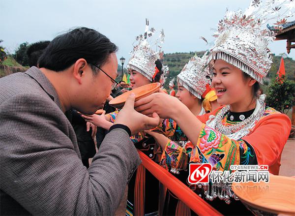 出了麻陽(yáng)高速出口,駕車不到3公里就來(lái)到了橙香園。車子還沒駛過(guò)第一座木牌樓,大老遠(yuǎn)的就聽到深遠(yuǎn)的苗鼓聲,跳躍的蘆笙聲,還有悠揚(yáng)悅耳的歌聲。停了車,循聲快步來(lái)到第二座木牌樓前,嗬,好不熱鬧!身著盛裝的苗家阿妹在牌樓門口一字排開,手舉牛角杯,攔門酒攔住了進(jìn)園的客人,小孩直接領(lǐng)進(jìn)門,大人就要喝過(guò)攔門酒才能被放行。