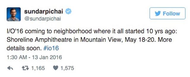 北京時間1月13日消息,谷歌CEO桑達爾·皮查伊(Sundar Pichai)在Twitter上宣布,2016年谷歌I/O開發(fā)者大會將于5月18日-20日在Mountain View的Shoreline Ampitheatre劇場舉行。