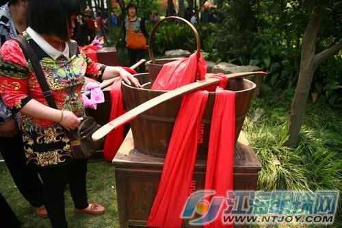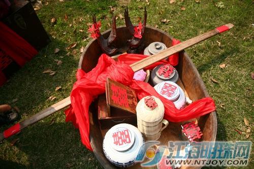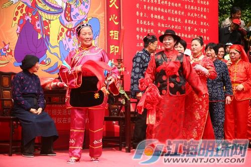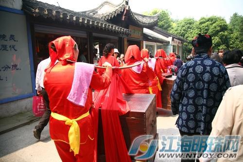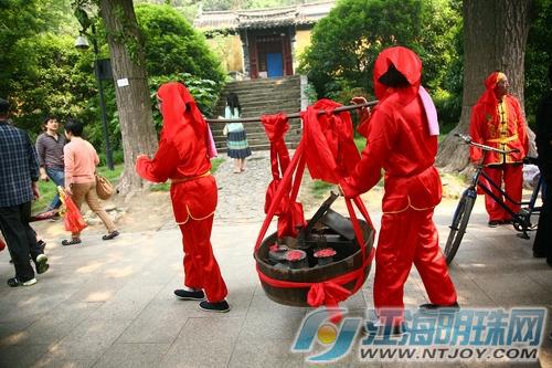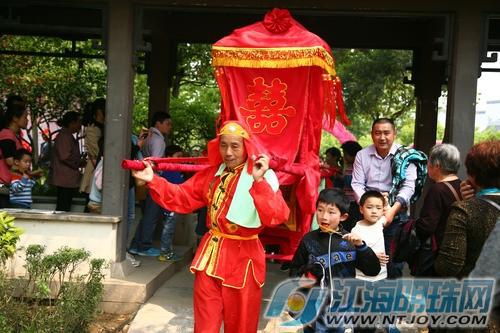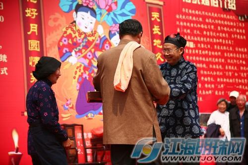 伴隨著悠揚悅耳的嗩吶聲以及鏗鏘有力的鑼聲,新娘蓋著紅蓋頭,坐在大花轎里,身后還有十多人抬著嫁妝,末端還有小孩兒壓車,隊伍在媒婆的帶領(lǐng)下浩浩蕩蕩向婚禮現(xiàn)場進(jìn)發(fā)。新娘子接來了,婚禮儀式就要正式開始了。但這時有個上菜的小二端個木頭托盤上來打岔,這是為什么呢?原來,小二是問新郎新娘還有他們的父母討要喜錢,寓意同喜。接下來,身穿喜服的新郎和新娘才在眾人的簇?fù)硐抡桨萏斓厮腿攵捶俊?jù)主辦方介紹說,南通人的傳統(tǒng)婚禮融合了很多漢族傳統(tǒng)古禮和婚俗習(xí)慣,整個婚禮有看親、說媒、迎娶、拜堂等近十道程序,非常熱鬧。