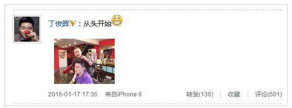 北京時間1月17日下午,丁俊暉更新了微博,微博內(nèi)容較為簡單,只有“從頭開始”加一個笑臉。丁俊暉還為這篇微博配了一張圖,圖片里,發(fā)型師正在為丁俊暉弄發(fā)型。不知,丁俊暉所寫的“從頭開始”是否有寓意、希望自己在今后的比賽中獲得佳績?
