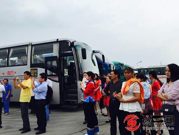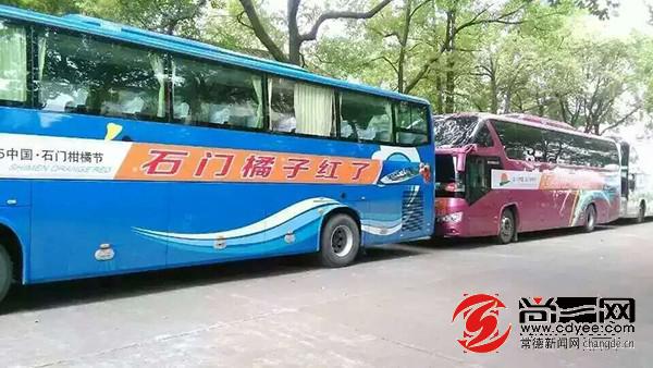 “石門橘子紅了”旅游大巴。尚一網(wǎng)記者 覃事恒 熊佳 攝