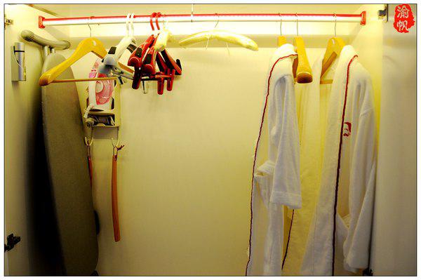 房間的衣柜,有熨斗、熨臺、睡袍等。