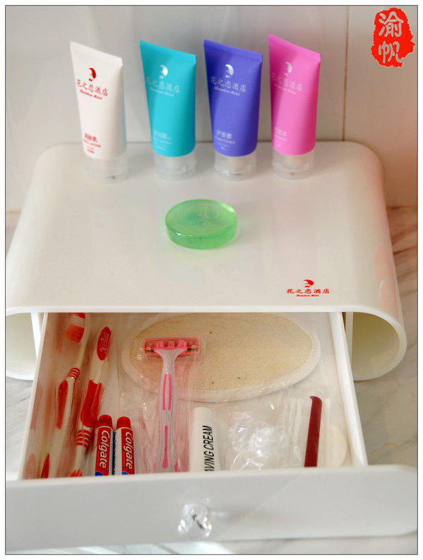洗手臺上放有各種洗浴用品,一應(yīng)俱全