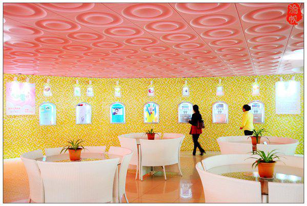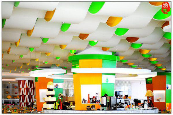 花之戀玫瑰西餐廳位于酒店大堂的右側(cè),主要由紅色、綠色、黃色和白色四種顏色搭配,頂上是波浪形的設(shè)計(jì),我們身在其中有一種非常輕松、歡樂的感覺。