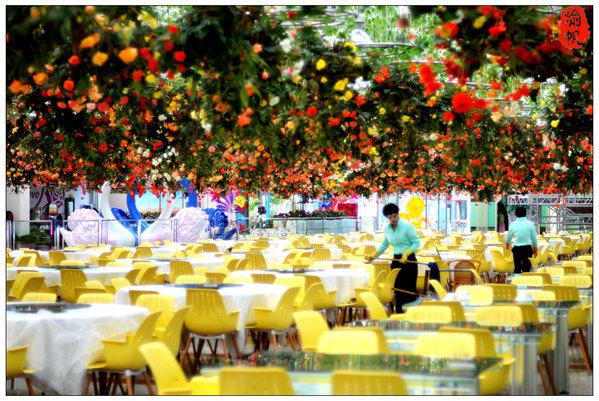 在鮮花餐廳,頭頂上全是各式各樣的真實(shí)鮮花,置身其中的感覺與一般餐廳里裝扮的假花完全不一樣,滿目花景,芬芳撲鼻。